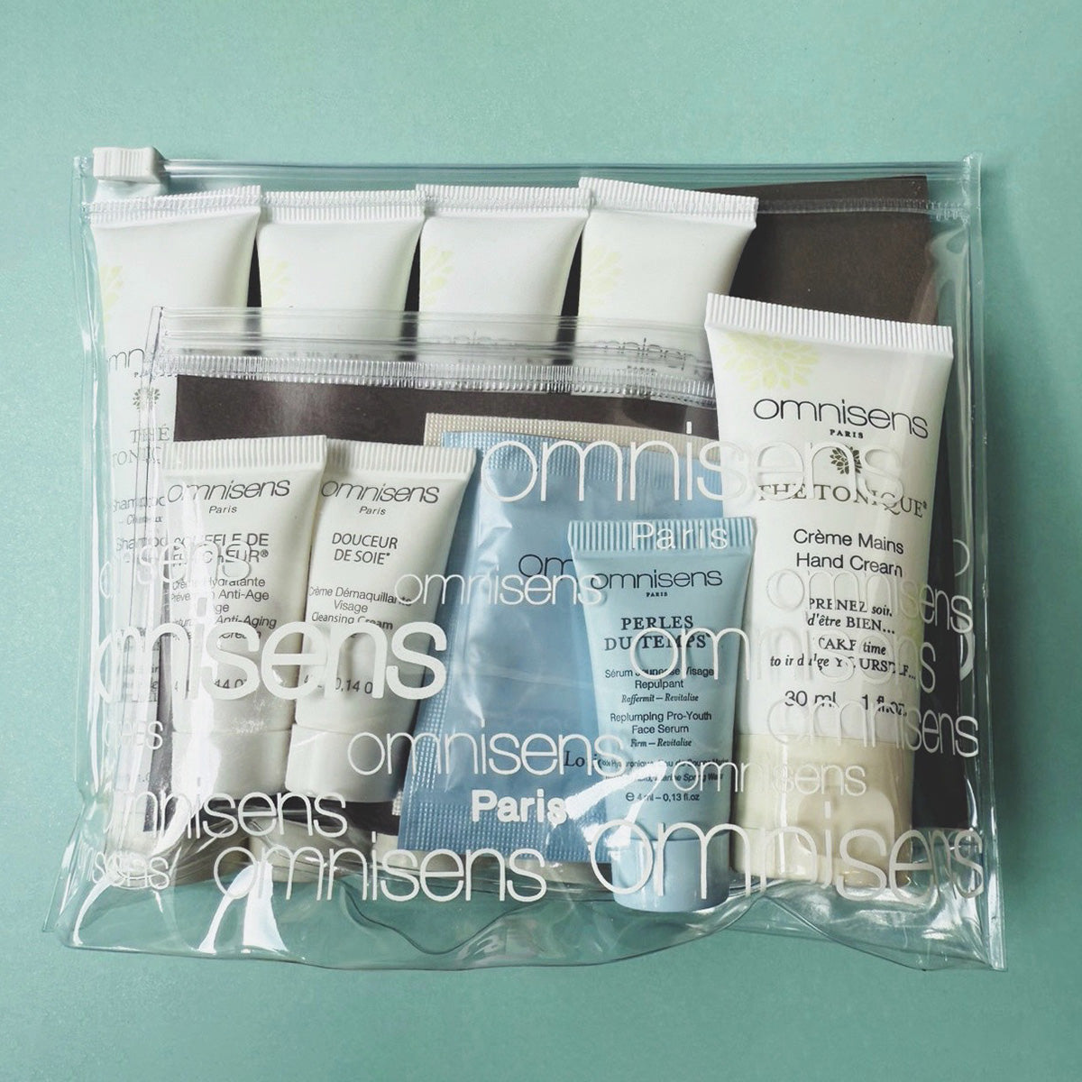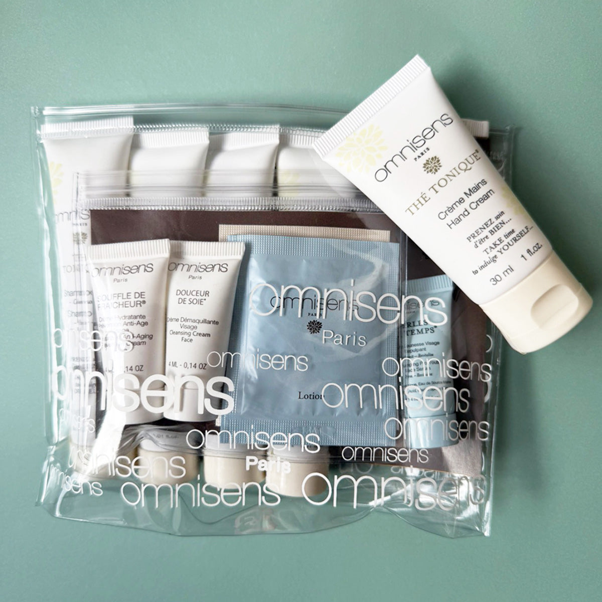 持ち運びやすいオリジナルポーチに、ヘアケア、フェイスケア、ボディケア製品が入っており、ご自宅でも旅先でもパリのスパの雰囲気を楽しんでいただけます。